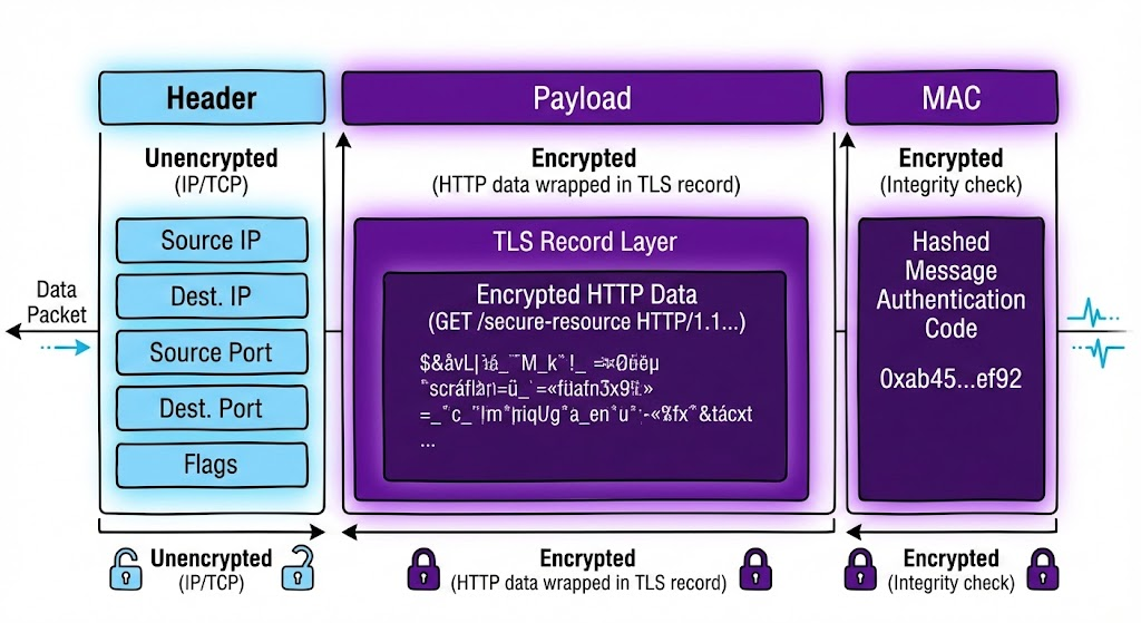 - Message Authentication Code (MAC) Algorithm (e.g., SHA256/GCM): Used to provide data integrity checks, ensuring the transmitted data has not been altered in transit. In modern TLS (1.3), encryption and integrity are combined using Authenticated Encryption with Associated Data (AEAD) schemes like AES-GCM.